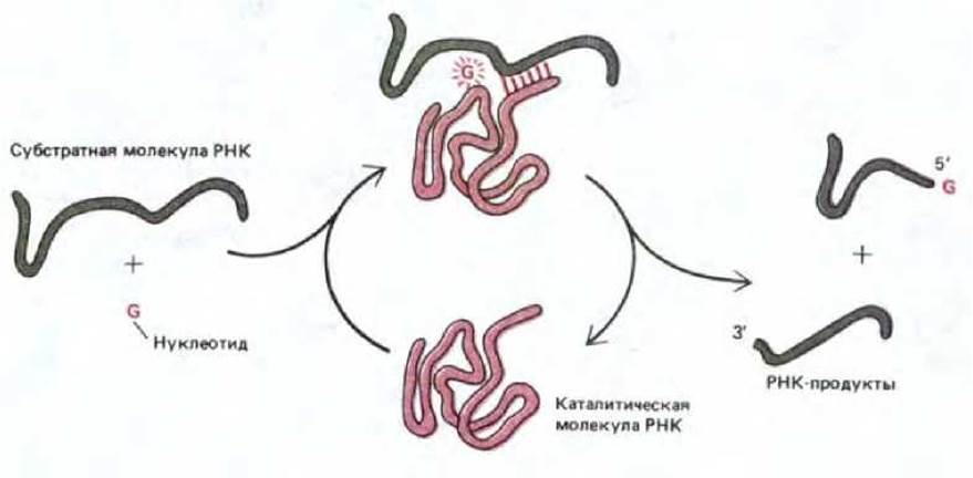 В последнее время были открыты некоторые другие семейства каталитических РНК. Например, большинство тРНК изначально синтезировались как предшественники РНК, затем было показано, что одна молекула РНК играет основную каталитическую роль в РНК-белковом комплексе, распознавая эти предшественники и разрезая их в специфических точках. Катализирующая последовательность РНК играет также важную роль в жизненном цикле многих растительных вирусов, подобная последовательность обнаружена в РНК лягушки, хотя ее роль в данном случае не доказана. Более примечательно то, что обнаружение катализа на основе РНК дает теперь основания подозревать, что рибосомы обладают более широкими функциями, чем предполагалось. Весьма вероятно, что рибосомные белки играют второстепенную роль по сравнению с рибосомными РНК, которые составляют более половины массы рибосомы.