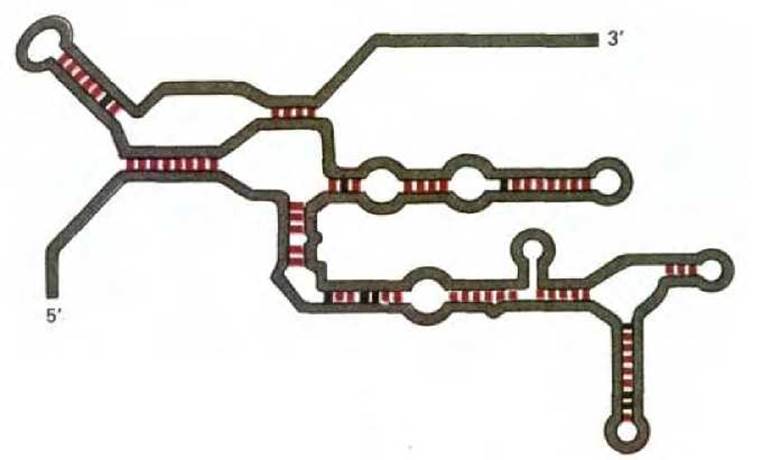 Рис. 3-21. Двумерное изображение каталитического остова интронной последовательности РНК, представленной на рис. 3-19 и рис. 3-20. Нормальные комплементарные пары оснований выделены цветом, а более слабые взаимодействия пар оснований показаны черным. Эта молекула содержит около 240 нуклеотидов; в нормальных условиях она свернута в плотную трехмерную структуру, но ее точная конформация неизвестна.