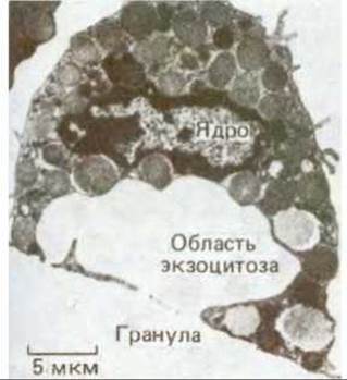 Рис. 6-71. Электронная микрофотография тучной клетки, активированной с целью вызвать секрецию гистамина. Активация проводилась с помощью стимулятора, «пришитого» к твердой грануле. Экзоцитоз идет только в той области клетки, которая контактирует с гранулой. (По D. Lawson et al., J. Cell. Biol., 79, 394-400, 1978, с разрешения Rockefeller University Press.)