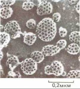 Рис. 6-73. Электронная микрофотография многочисленных окаймленных ямок и пузырьков на внутренней поверхности плазматической мембраны фибробластов в культуре. Клетки были быстро заморожены в жидком гелии, подвергнуты скалыванию и затем глубокому травлению, чтобы сделать видимой цитоплазматическую поверхность плазматической мембраны. (По J. Heuser, J.Cell. Biol., 84, 560-583, 1980, с разрешения Rockefeller University Press.)