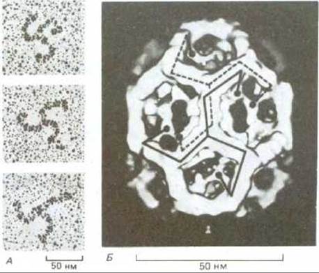 Рис. 6-74. Структура клатриновой оболочки. А. Электронные микрофотографии клатриновых трискелеонов, оттененных платиной. Каждый трискелеон состоит из трех тяжелых и трех легких полипептидных цепей клатрина. Естественно, эти детали на микрофотографиях не видны. Б. Трехмерная модель клатриновой оболочки. 36 трискелеонов образуют сеть из 12 пятиугольников и 8 шестиугольников. Концы двух трискелеонов отмечены на фотографии. Обратите внимание, что каждая ножка трискелеона проходит вдоль двух соседних граней многоугольника и затем поворачивает внутрь, так что их N-концевые домены (черные кружки) образуют внутренний остов оболочки. То, что гибкие концы трискелеонов перекрываются друг с другом, обеспечивает как механическую прочность, так и подвижность всей структуры. Клатриновые оболочки других размеров и форм сконструированы аналогичным образом из 12 пятиугольников и различного числа шестиугольников. (А - Ungewickell и D. Branton, Nature, 289, 420-422, 1981; Б - G.P.A. Vigers et al., EMBO J., 5, 2079-2085, 1986.)