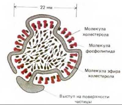 Рис. 6-75. Схематическое изображение липопротеиновой частицы низкой плотности (ЛНП) в поперечном разрезе. Каждая сферическая частица с массой 3 х 106 Да содержит около 1500 молекул эфира холестерола, окруженных липидным монослоем, состоящем из ~800 фосфолипидных и 50 холестерольных (не этерифицированных) молекул. Структуру частицы организует одна молекула белка (500000 Да), ответственная за специфическое связывание ЛНП с рецепторным белком клеточной поверхности.