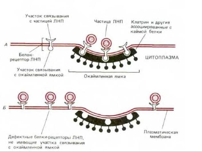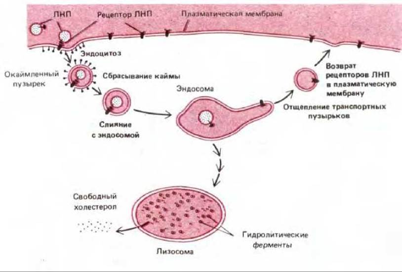Этот путь нарушается у некоторых индивидуумов, унаследовавших дефектные гены белков-рецепторов ЛНП: их клетки не способны поглощать ЛНП из крови. Обусловленный этим дефектом высокий уровень холестерола в крови таких индивидуумов создает предрасположение к преждевременному атеросклерозу, так что большинство из них умирает в раннем возрасте от коронарной болезни сердца. Аномалия может также быть связана с утратой рецепторами участка связывания либо с ЛНП, либо с окаймленной ямкой (см. рис. 6-76, Б). В последнем случае имеется достаточное число белков-рецепторов ЛНП, но они не собираются в окаймленных участках плазматической мембраны. ЛНП связываются с поверхностью таких мутантных клеток, однако внутрь не проникают. Это прямо доказывает важность окаймленных ямок в опосредуемом рецепторами эндоцитозе холестерола.