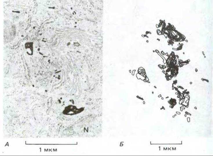 Рис. 6-78. Электронная микрофотография (А) и схематическое изображение (Б) перинуклеарных эндосом из молодых клеток почек хомячка, растущих в культуре. Клетки инкубировали в среде, содержащей пероксидазу, 15 мин при 37 °С, что вполне достаточно для поглощения пероксидазы путем жидкофазного эндоцитоза и переноса в эндосомы (и эндолизосомы, см. текст), но недостаточно для поступления в лизосомы. После фиксации клеток и выдерживания их с субстратом пероксидазы (диаминобензидином) продукты ферментативной реакции фиксировали тетроксидом осмия для увеличения электроноплотности. На (Б) изображена усредненная картина, полученная из 18 тонких срезов. Ядро клетки обозначено буквой N. (А). (Marsh et al., Proc. Natl. Acad. Sci. USA, 83, 2899-2903, 1983.)