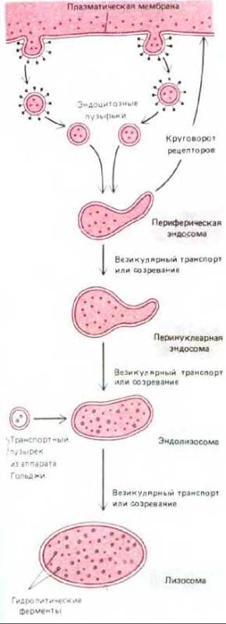 Большинство частиц и молекул, поглощенных клеткой посредством фагоцитоза или пиноцитоза заканчивают свой путь в лизосомах. Большие частицы включаются в фагосомы, которые затем, видимо, сливаются с лизосомами, образуя фаголизосомы. Жидкость и макромолекулы, поглощенные при пиноцитозе, первоначально переносятся в промежуточные мембраносвязанные органеллы, называемые эндосомами, откуда они в конце концов либо переходят в Лизосомы, либо специфическим образом возвращаются обратно. Поскольку в лизосомах имеются разнообразные гидролитические ферменты (см. разд. 8.8.1), большая часть материала, содержащегося в фагосомах и эндосомах, слившихся с лизосомами, быстро разрушается, низкомолекулярные продукты распада, такие, как Аминокислоты, сахара и Нуклеотиды, транспортируются через мембрану лизосомы в цитозоль, где они могут быть использованы клеткой. Большинство же мембранных компонентов эндоцитозных пузырьков возвращаются с помощью экзоцитоза из фагосом и эндосом и повторно утилизируются в плазматической мембране.