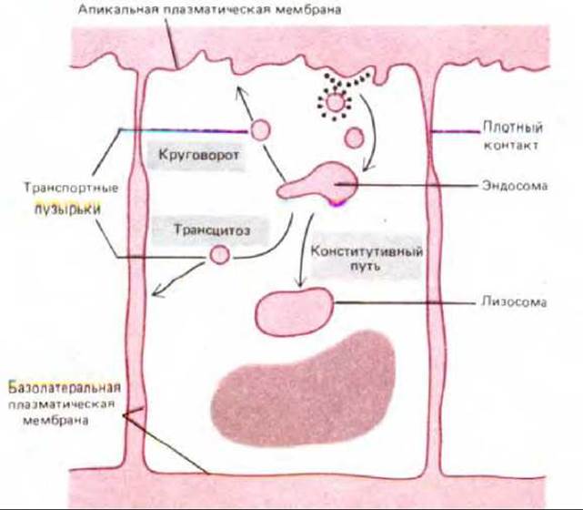 Рис. 6-80. Три пути из эндосомного компартмента в эпителиальных клетках. Большинство молекул, которые не возвращаются обратно из эндосом (или эндолизосом, не показано) в мембрану, идут далее по конститутивному пути из эндосомного компартмента в лизосомы. Возвращенные молекулы попадают либо в ту же область плазматической мембраны, откуда они были поглощены (рециркуляция), либо в другой домен плазматической мембраны (трансцитоз).