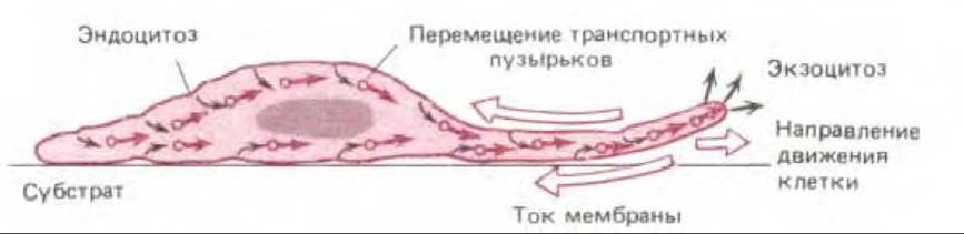 Рис. 6-81. Текучесть плазматической мембраны подвижных клеток как результат асимметрии эндоцитозного цикла в этих клетках. Фибробласт (показан в разрезе) движется слева направо. Эндоцитоз мембраны, содержащей рецепторы, происходит в окаймленных ямках, распределенных по клеточной поверхности случайным образом. Поглощенная мембрана возвращается из эндосомного компартмента (не показан) в виде экзоцитозных пузырьков, сливающихся с мембраной передней (по отношению к движению клетки) оконечности клетки. Таким образом, эндоцитоз по всей поверхности и направленный экзоцитоз вызывают перетекание компонентов мембраны в направлении, обратном движению клетки (показано большими цветными стрелками). (По М. S. Bretscher, Science, 224, 681-686, 1984.)
