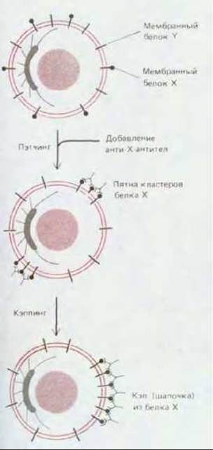 При связывании мультивалентных лигандов (таких, например, как антитела и лектины) со специфическими белками мембраны образуются кластеры, которые, объединяясь между собой, формируют пятна (пэтчи). Этот процесс называется пэтчингом (от. англ. patching - ставить заплаты). Такие пятна быстро движутся по поверхности клетки (например, лимфоцита), собираясь в так называемый «кэп» или шапочку (рис. 6-82). Процесс образования шапочки, кэппинг, занимает всего лишь несколько минут. Он является АТР-зависимым и завершается (в лимфоцитах) появлением этой необычной структуры в задней части клетки. Интересно, что формировать кэп способны лишь клетки, умеющие ползать по поверхности, хотя для этого процесса никакой необходимости в движении клетки нет. Это наводит на мысль, что механизм кэппинга может иметь сходство с механизмами, используемыми клеткой для движения. Одна из гипотез заключается в том, что мембранный поток, описанный выше и возникающий при циклическом эндоцитозе, переносит большие кластеры связанных молекул в задний конец клетки, тогда как свободные (несшитые между собой) белки достаточно быстро диффундируют, и, следовательно, их распределение остается случайным несмотря на поток. Альтернативная гипотеза состоит в том, что кластеры мембранных белков взаимодействуют (прямо или опосредованно) с движущей системой внутри клеточных актиновых филаментов (находящихся в кортексе, непосредственно под плазматической мембраной), которая перемещает кластеры к заднему концу клетки. До сих пор нет четких результатов, исключающих какую-либо из гипотез.