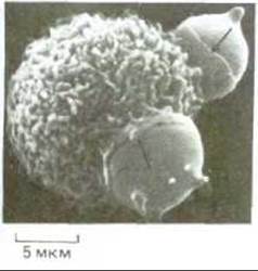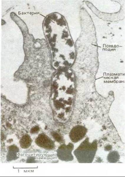 Рис. 6-84. Электронная микрофотография нейтрофила, поглощающего посредством фагоцитоза бактерию, которая находится в процессе деления. (С любезного разрешения Dorothy F. Bainton.)