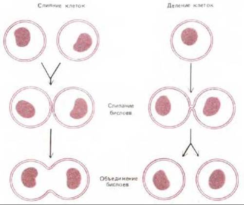 Рис. 6-86. Слияние мембран (включает два этапа: слипание бислоев и их объединение), происходящее при делении и слиянии клеток. В природе Слияние клеток наблюдается в процессе оплодотворения (слияние сперматозоида с яйцеклеткой), а также при образовании многоядерных клеток скелетных мышц (слияние миобластов).