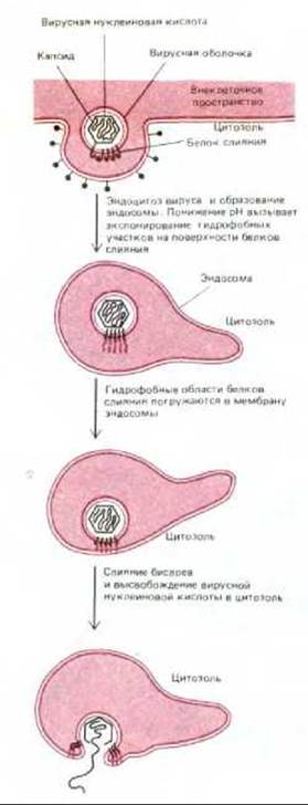 Рис. 6-87. Схема, показывающая, как белки слияния, имеющиеся На поверхности многих вирусов с мембранной оболочкой, катализируют слияние вирусной и эндосомной мембран. Вирусы проникают в клетку путем опосредуемого рецепторами эндоцитоза и попадают в эндосомы; низкий рН внутри эндосом активирует белок, катализирующий слияние мембран. Это позволяет вирусному капсиду высвободиться в цитозоль, где нуклеиновая кислота вируса может реплицироваться.