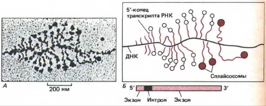 Биохимический анализ выявил в клеточном ядре еще один класс частиц, состоящих из белка и маленьких молекул РНК (250 нуклеотидов или меньше), которые произвольно были обозначены U1, U2, ..., U12-PHK. Эти комплексы, названные малыми ядерными рибонуклеопротеинами (мяРНП), напоминают Рибосомы в том отношении, что каждая из этих частиц содержит набор белков, связанных со стабильной молекулой РНК. По размеру, однако, эти частицы гораздо меньше рибосом (около 250000 дальтон по сравнению с 4,5 млн. дальтон рибосомы), кроме того, в этих частицах отношение белок/РНК выше, чем у рибосом. Некоторые белки входят в состав различных типов мяРНП, другие присуши только одному типу частиц. Впервые это удалось показать в опытах с сывороткой крови, полученной от больных системной красной волчанкой. У таких больных в крови имеются Антитела к одному или более белку, входящему в состав мяРНП. Например, оказалось, что одно и то же антитело связывает U1-, U2--, U5- и U4/б-мяРНП. По-видимому, это объясняется тем, что в их состав входит один и тот же белок. Полагают, что отдельные мяРНП на основе комплементарности узнают специфические последовательности нуклеиновой кислоты. Некоторые частицы, вероятно, участвуют в сплайсинге РНК; какие-то мяРНП вовлечены в реакции расщепления, в ходе которых образуется 3'-конец вновь синтезированных РНК; функция других мяРНП неизвестна. Доказательства участия мяРНП в сплайсинге получены в опытах по изучению процессинга РНК in vitro.