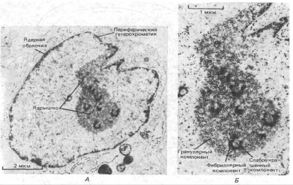 Обычная Электронная Микроскопия тонких срезов выявляет лишь гранулированные глыбки хроматина, указывая на наличие развитой внутриядерной структуры (рис. 9-100), но дает очень мало информации о том, как именно транскрибируются гены. Гораздо более информативны в этом отношении снимки изолированного ядерного содержимого, непосредственно наносимого на электронномикроскопическую сеточку после разрушения ядер (рис. 9-70 и 9-71). На достаточном удалении от центра разрушенного ядра концентрация хроматина относительно низка, что позволяет рассмотреть индивидуальные хроматиновые фибриллы, имеющие характерный вид «бус на нитке».