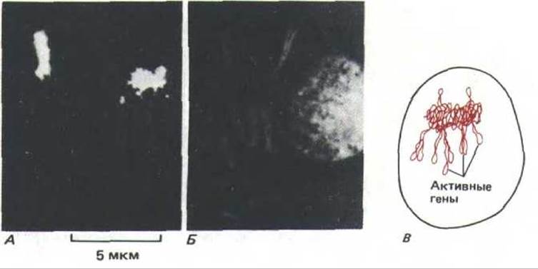 До сих пор мы говорили о хромосоме, как об очень крупном комплексе ДНК и белка, который перед делением Клетки реплицируется. Однако главное предназначение хромосомы - служить матрицей для синтеза молекул РНК, поскольку только в таком виде Генетическая информация, заключенная в хромосомах, непосредственно используется клеткой. РНК синтезируется весьма интенсивно: общая скорость включения нуклеотидов в РНК во время интерфазы примерно в 20 раз превышает скорость включения нуклеотидов в ДНК в S-фазе.