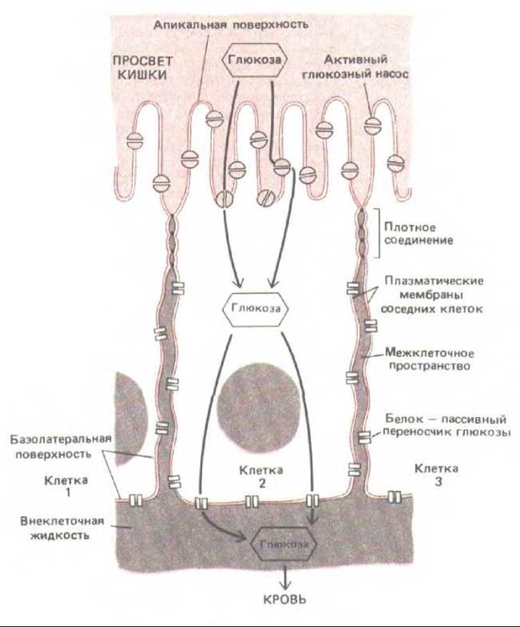 Эпителиальные клетки, выстилающие тонкий кишечник, удерживают большую часть содержимого кишки в ее внутренней полости (просвете). Однако в то же время они должны перекачивать определенные питательные вещества через клеточный пласт во внеклеточную жидкость соединительной ткани по другую сторону пласта (см. рис. 14-1), откуда эти вещества диффундируют в кровеносные сосуды. Такой трансэпителиальный перенос осуществляют две группы транспортных белков, связанных с мембраной. Одна группа расположена на апикальной поверхности (обращенной в просвет кишки) и активно переносит избранные молекулы из просвета в эпителиальные клетки; другая группа расположена на базолатеральных (базальных и латеральных) поверхностях клеток и позволяет тем же молекулам выходить из клеток, облегчая диффузию во внеклеточную жидкость по другую сторону эпителия (рис. 14-2). Для поддержания такого направленного транспорта нужно, чтобы апикальные транспортные белки не могли переходить на базолатеральную поверхность клетки, а базолатеральные - на апикальную поверхность. Кроме того, щели между эпителиальными клетками должны быть так закупорены, чтобы транспортируемые молекулы не могли диффундировать обратно в полость кишки через межклеточные пространства «вниз» по градиентам концентрации, создающимся в результате трансэпителиального переноса.