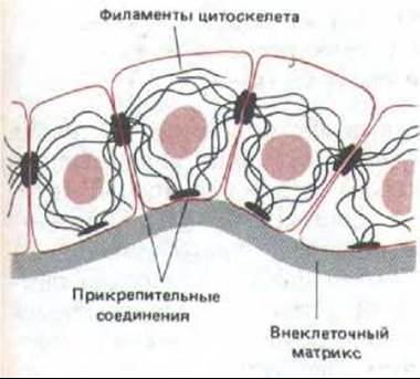 Существуют два основных типа прикрепительных контактов: адгезионные соединения и десмосомы. Все они объединяют группы клеток в прочные структурные комплексы, связывая элементы их цитоскелетов. Адгезионные соединения связывают пучки актиновых филаментов, а десмосомы-промежуточные филаменты. Щелевые контакты служат для межклеточной коммуникации и состоят из групп канальных белков, позволяющих частицам с мол. массой менее 1500 непосредственно переходить из одной клетки в другую. Клетки, связанные такими контактами, обмениваются многими неорганическими ионами и другими малыми молекулами, т, е. они химически и электрически сопряжены. Щелевые контакты имеют большое значение для координации функций электрически активных клеток и, по-видимому, играют сходную роль также в других группах клеток.