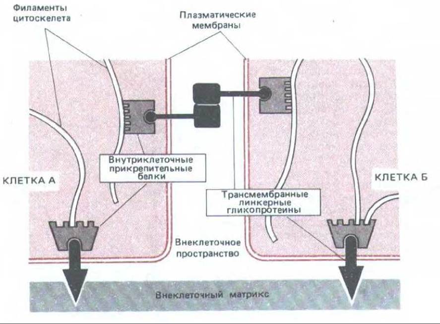 Рис. 14-7. Схема функциональной роли двух групп белков, образующих прикрепительные контакты: внутриклеточных прикрепительных белков и трансмембранных линкерных гликопротеинов. В данном примере внеклеточные домены трансмембранных линкерных гликопротеинов, скрепляющих клетки, взаимодействуют непосредственно. В других случаях они могут быть соединены дополнительными белками, находящимися во внеклеточном пространстве. Комплексы внутриклеточных прикрепительных белков связывают линкерные гликопротеины с цитоскелетом.