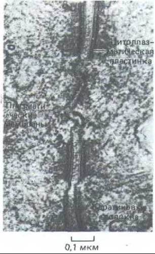 Рис. 14-10. Электронная микрофотография трех десмосом между двумя эпителиальными клетками в кишке крысы. [N. В. Gilula. In: Cell Communication (R.P. Cox, ed.), pp. 1-29. New York, Wiley, 1974. Reprinted by permission of John Wiley a. Sons, inc.]