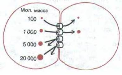 Рис. 14-13. Если в одну из двух клеток, соединенных щелевым контактом, ввести флуоресцирующие молекулы разной величины, то в другую клетку будут переходить лишь те из них, у которых мол. масса не превышает примерно 1000-1500 (в зависимости от типа клеток), а более крупные проходить не будут. Это соответствует эффективному диаметру межклеточного канала около 1,5 нм.