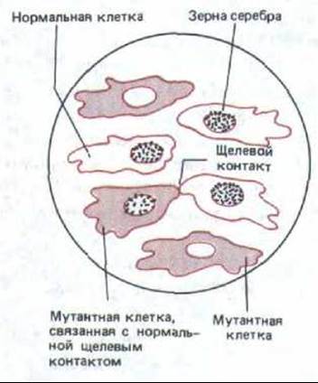 Рис. 14-14. Здесь схематически представлен радиоавтограф, демонстрирующий метаболическое сопряжение клеток, связанных щелевыми контактами, в культуре in vitro. Мутантные клетки лишены фермента тимидинкиназы и поэтому не могут включать в ДНК радиоактивный тимидин, добавленный в среду. Нормальные клетки способны включать тимидин в ДНК, и поэтому их ядра усеяны черными точками (зернами серебра в радиоавтографе). Как видно, в смешанной культуре нормальных и мутантных клеток радиоактивную метку включают также ядра тех мутантных клеток, которые соприкасаются с нормальными и устанавливают с ними щелевые контакты. Это обусловлено тем, что в нормальной клетке радиоактивный тимидин фосфорилируется тимидинкиназой с образованием тимидинтрифосфата; затем радиоактивный тимидинтрифосфат переходит через щелевые контакты в мутантную клетку и включается в ее ДНК.