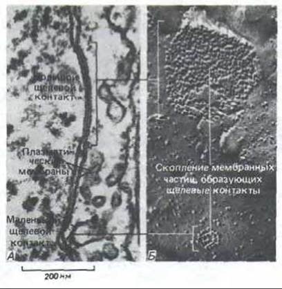 Рис. 14-16. Большой и маленький щелевые контакты между фибробластами в культуре. Электронные микрофотографии тонкого среза (А) и препарата, полученного методом замораживания -скалывания (Б). На сколе каждый щелевой контакт выглядит как скопление гомогенных межмембранных частиц, ассоциированных только с цитоплазматической стороной скола мембраны. Каждая межмембранная частица соответствует коннексону, показанному на рис. 14-15. [N.B. Gilula. In: Cell Communication (R.P. Cox, ed.), pp. 1-29. New York, Wiley, 1974. Reprinted by permission of John Wiley a. Sons, Inc.]