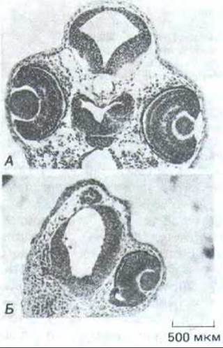 Рис. 14-18. Действие антител к главному белку щелевого контакта, инъецированных в одну из клеток раннего зародыша Xenopus. Поперечные срезы нормального эмбриона (А) и зародыша после инъекции антител на 8-клеточной стадии (Б). Обратите внимание, что у второго из них на стороне инъекции отсутствует глаз и недоразвит мозг. (A. Warner, S. Guthrie, N. В. Gilula, Nature 331: 126-131, 1985. Copyright 1985 Macmillan Journals Limited.)