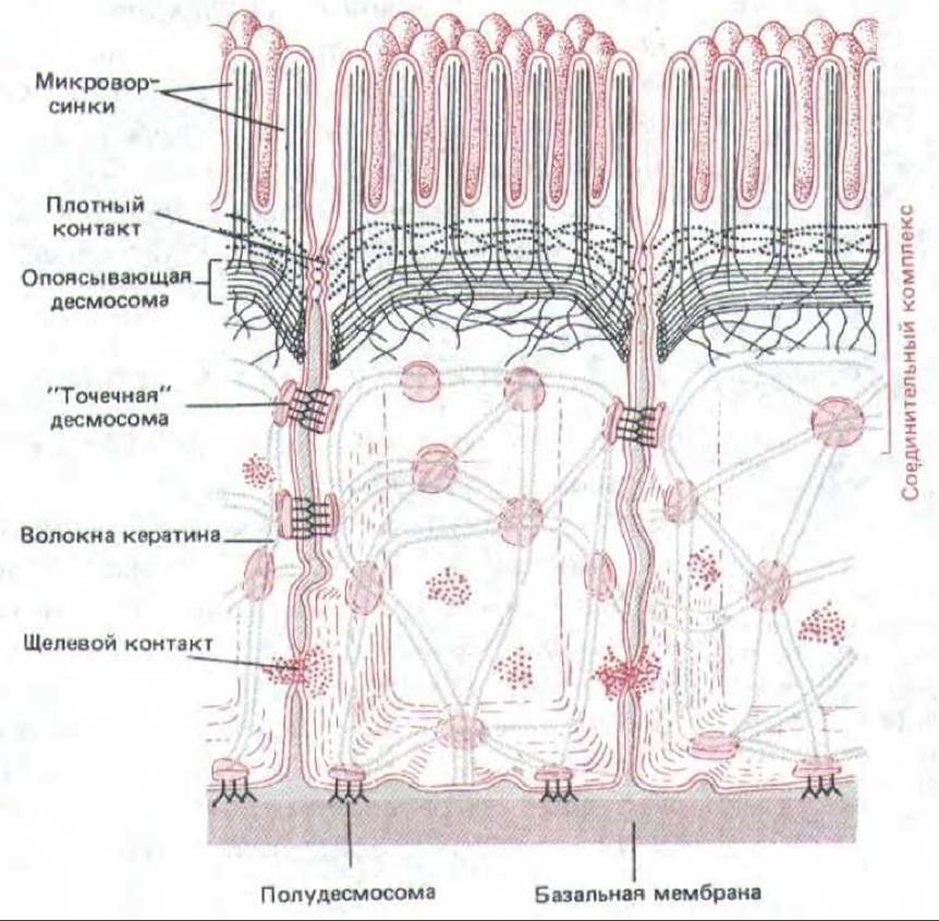 Рис. 14-19. Схема расположения различных соединений, образуемых эпителиальными клетками тонкой кишки.