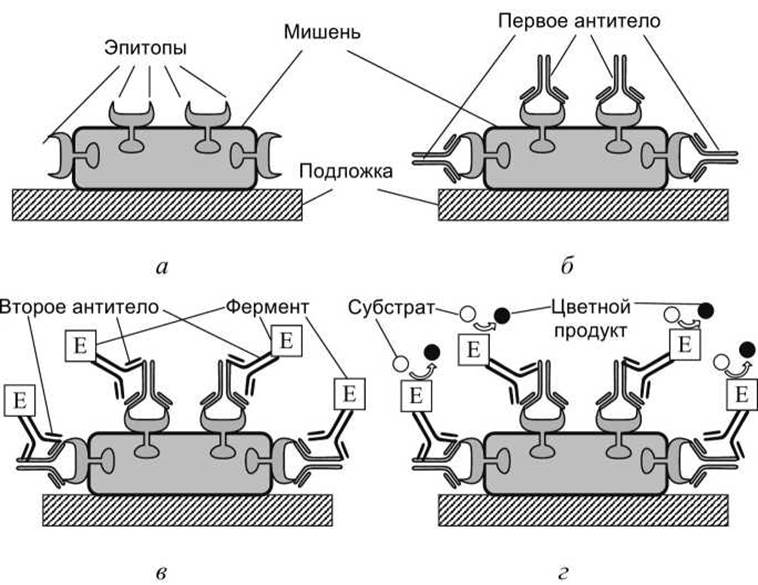 Во многих тест-системах используют конъюгаты вторых антител с ферментом (Е), например, с щелочной фосфатазой. После отмывания фильтра добавляют бесцветный субстрат. Если вторые антитела связываются с первыми, то под действием фермента происходит Гидролиз субстрата с образованием окрашенного вещества в том месте, где идет реакция (рисунок 111(г)).