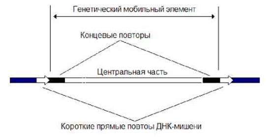 В результате транспозиции (особых рекомбинационных процессов) происходит перемещение мобильных генетических элементов из одного участка молекулы ДНК в другой участок или другую молекулу ДНК. Мобильные элементы характерны как для прокариот, так и для эукариот. Они, как правило, построены из центральной части, на флангах которой расположены обращенные или прямые концевые повторы (рис. 9.7). В центральной области обычно присутствует ген(ы), ответственный(ые) за транспозицию. Встраивание мобильных элементов в результате транспозиции чаще всего не является специфичным и происходит в случайные участки ДНК. Большинство мобильных элементов с обеих сторон ограничены короткими прямыми повторами ДНК-мишени (обычно 5 или 9 п.н.), возникшими в результате дупликации ДНК-мишени при транспозиции элемента.