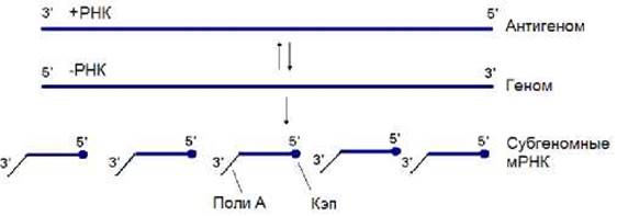 Геном таких вирусов может быть представлен одной или несколькими молекулами (-)РНК. В состав вирусных частиц входит РНК-полимераза, способная использовать (-)РНК в качестве матрицы для синтеза (+)РНК.