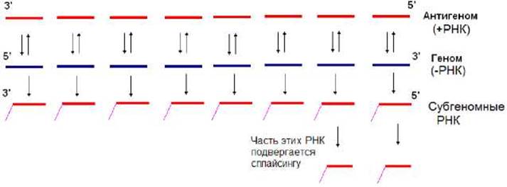 Рис. 11.18. Схема репликации и транскрипции генома ВВС