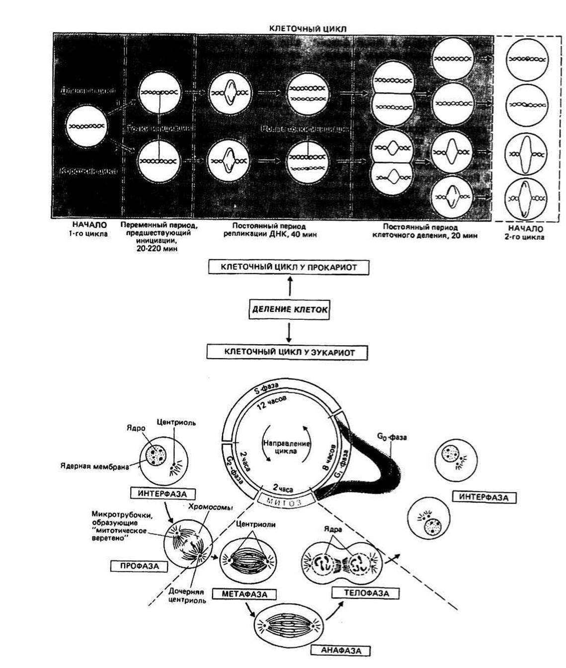 Клеточный цикл — это последовательность событий, происходящих во время деления Клетки, в результате которой образуются две дочерние клетки. Элементы клеточного цикла прокариотических клеток пока охарактеризованы недостаточно полно. Напротив, для эукариот четко установлен набор событий в клетке, порядок которых в цикле фиксирован, но время протекания может сильно варьировать.