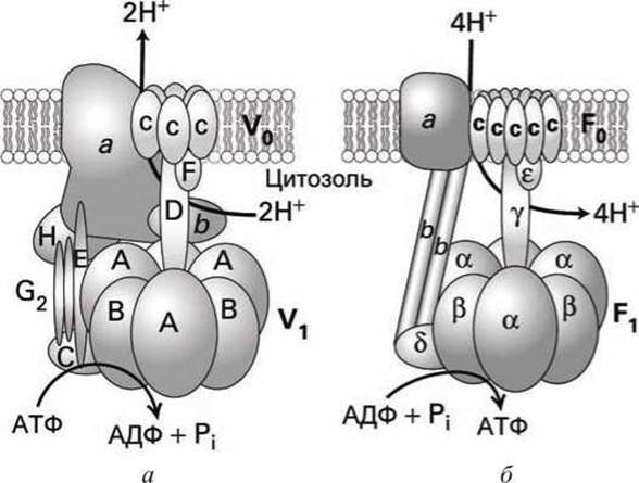 Рисунок 63 - Схема АТФ-насосов: а - V-класса, б - F-класса