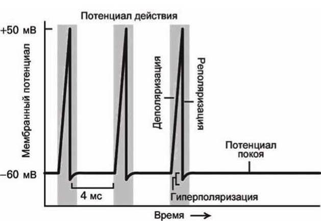 Как было показано выше (п. 12.1), потенциал действия представляет собой набор резких изменений (скачков) мембранного потенциала от значений порядка -60 мВ (Потенциал покоя) до значений порядка +50 мВ (в сумме на 110 мВ). Вслед за такой деполяризацией мембраны следует быстрая реполяризация, возвращающая Мембранный потенциал к значению потенциала покоя (рисунок 124).