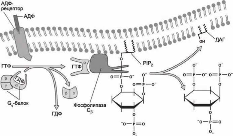 Молекулы АДФ могут оказаться в крови только в результате механического повреждения клеток. Соединение АДФ с мембранным GPCR-рецептором на поверхности тромбоцита активизирует этот рецептор и он становится GEF-белком (Guanine nucleotide Exchange Factor (рисунок 79)) для тримерного белка Gq, который обладает ГТФазной активностью и в свою очередь активирует ß-изоформу фермента фосфолипаза С (точное название фермента — фосфоинозитид фосфолипаза С).