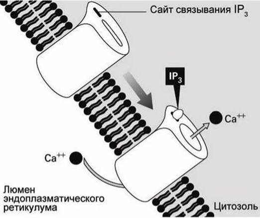 Кальций из эндоплазматического ретикулума выходит через инозитол-трисфосфат-регулируемые кальциевые каналы, а инозитол трисфосфат (ІР3) образуется ß-изоформой фермента фосфолипаза С (PLCß) при ферментативном гидролизе фосфолипида плазматической мембраны фосфатидилинозитол бисфосфат (РIР2).