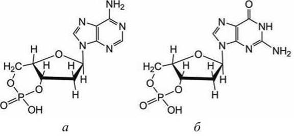 Рисунок 144 - Схемы циклических пуриновых нуклеозидмонофосфатов: а - цАМФ; б - цГМФ