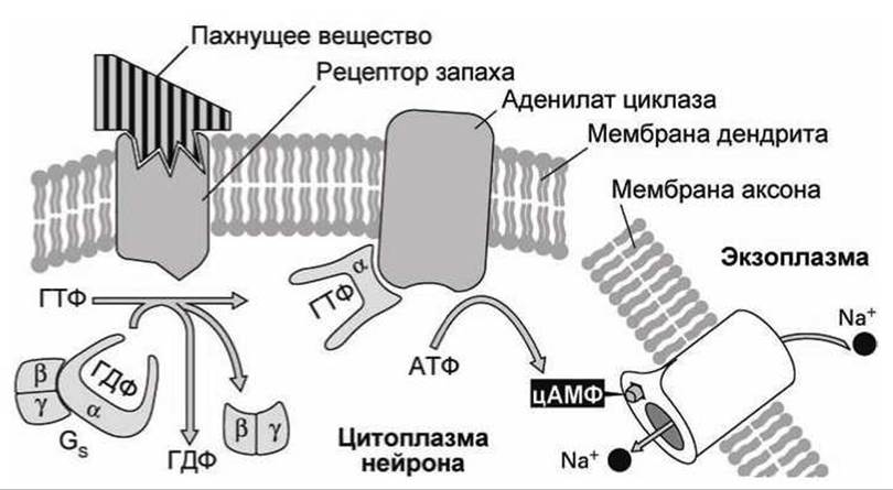 Связанная с ГТФ субъединица а белка Gs в свою очередь активизирует мембранный фермент аденилат циклаза, который превращает АТФ в цАМФ. Затем цАМФ диффундирует в цитозоле нейрона к цАМФ-управляемым каналам в мембране аксона. Связывание с молекулой цАМФ открывает этот канал, что позволяет ионам калия и натрия перемещаться через мембрану. Электрохимический градиент стимулирует значительный поток ионов натрия внутрь клетки, что приводит к деполяризации мембраны, Потенциалочувствительные натриевые каналы открываются, и развивается Потенциал действия, который распространяется по аксону в ГОЛОВНОЙ МОЗГ И сигнализирует о наличии пахнущего вещества. Белок Gs и фермент аденилат циклаза обнаружены во многих клетках, однако только в клетках нейронов, чувствительных к запаху, имеются рецепторы пахнущих веществ. Другие клетки используют внутриклеточный месенджер цАМФ для реагирования на те химические внеклеточные сигналы, для которых в мембранах клеток есть соответствующие рецепторы. После того, когда внешний химический сигнал исчезает, концентрация цАМФ снижается до исходного уровня. Фермент цАМФ-фосфодиестераза гидролизует цАМФ до АМФ, что инактивирует цАМФ-управляемые каналы и другие цАМФ-чувствительные Белки.