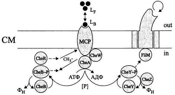В центре каскада реакций фосфорилирования/дефосфорилирования находится двухкомпонентная сигнальная система CheA/CheY.