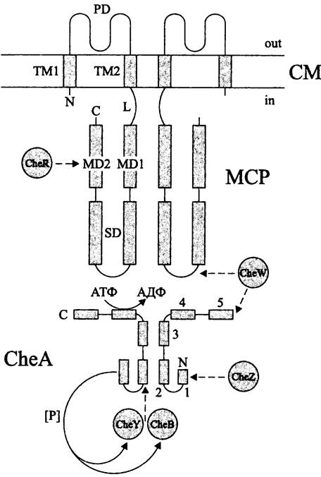 Протеинкиназа CheA состоит из доменов Р1 — Р5 (рис. 266):