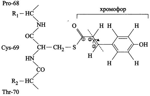 Хромофор E-PYP уникален — это 3-n-гидроксибензилпропеновая кислота (тривиальные названия: n-гидроксикоричная, n-кумаровая), которая через тиоэфирную связь присоединяется к остатку Cys-69 (рис. 267).