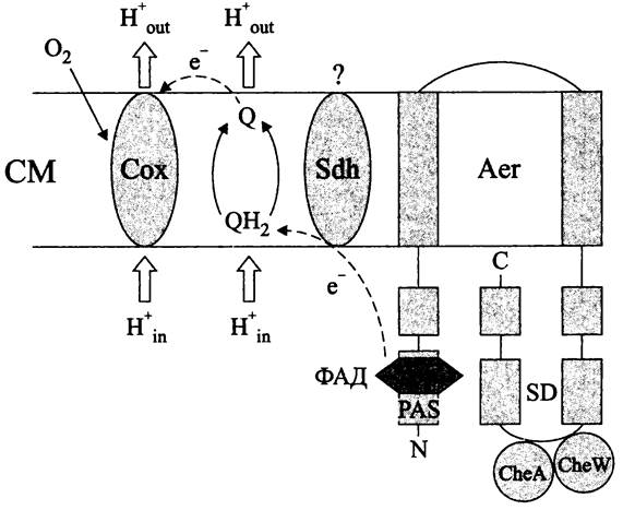 При аэротаксисе Е. coli в качестве хеморецептора используется мембраносвязанный белок Аег (рис. 268). Его цитоплазматический С-концевой сигнальный модуль гомологичен С-концевым доменом других хеморецепторов, однако, в отличие от хеморецепторов Tsr, Таг, Таг и Trg, в нем нет сайтов для метилирования. В составе цитоплазматического N-концевого сенсорного модуля имеется PAS-домен, с которым нековалентно связан флавиновый кофактор — ФАД. Сигнальный и сенсорный модули заякорены в СМ с помощью двух трансмембранных модулей.