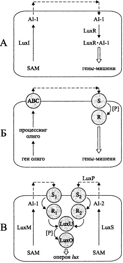 Рис. 269. QS-системы, обеспечивающие чувство кворума. А — у большинства грамотрицательных бактерий; Б — у грамположительных бактерий; В — у Vibrio harvey.