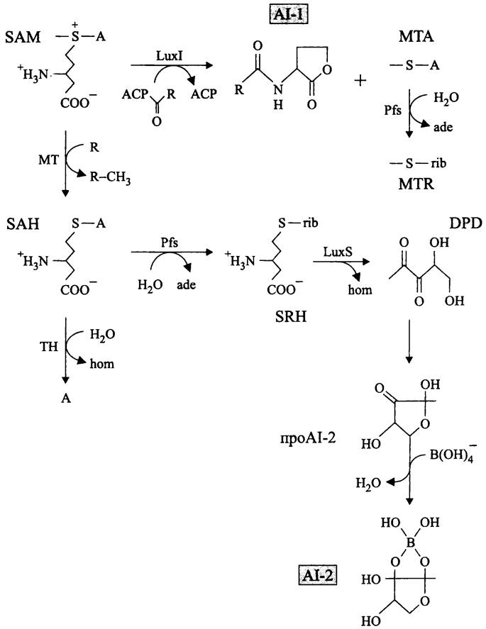 Автоиндуктор AI-1 образуется из SAM за один этап, с помощью синтазы Luxl. Донором жирнокислотного остатка для AHL, как правило, является ацилпереносящий белок. В качестве побочного продукта образуется токсичный метилтиоаденозин (англ. methylthioadenosine, МТА), который гидролизуется 5'-метилтиоаденозин/S- аденозилгомоцистеин-нуклеозидазой Pfs с образованием аденина и метилтиорибозы (англ. methylthioribose, MTR).