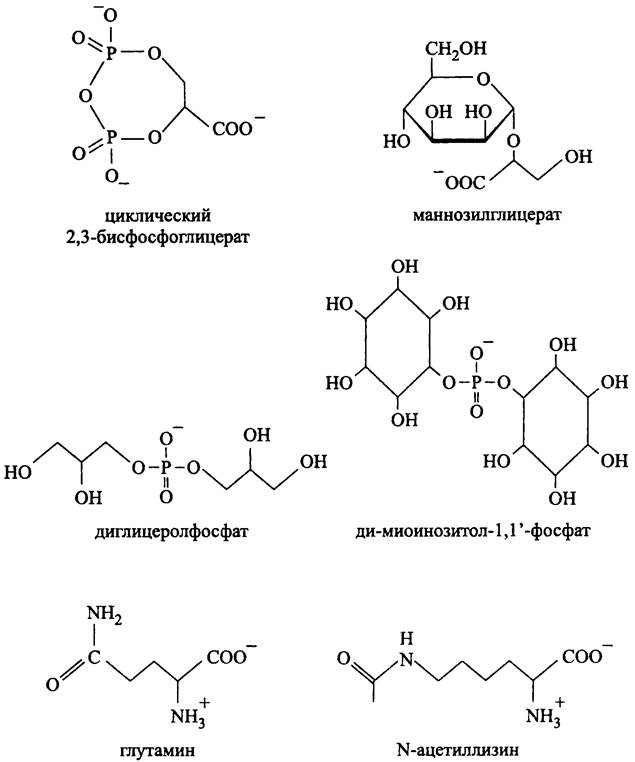 Осмопротекторы архей (рис. 273). Хотя осмопротекторы архей по структуре напоминают осмопротекторы бактерий, большинство из них несет отрицательный заряд, что связано с присутствием карбоксильных, фосфорильных или сульфонильных групп; предполагается, что это позволяет компенсировать заряд катионов К+, которых обычно много в цитоплазме архей. К ним относятся циклический 2,3- бисфосфоглицерат, маннозилглицерат, диглицеролфосфат и ди-миоинозитол-1,1'- фосфат (последний также накапливается при тепловом шоке; см. выше). Трегалоза, тривиальный осмопротектор мезофильных бактерий, у архей встречается крайне редко; примерами служат Pyrobaculum aerophilum, и Thermoproteustenax.