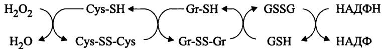 Рис. 276. (Дез)активация белка OxyR. Cys-SS-Cys - активная (окисленная) форма белка OxyR; Cys-SH — неактивная (восстановленная) форма белка OxyR; Gr-SH — восстановленный глутаредоксин А; GSH — восстановленный глутатион.