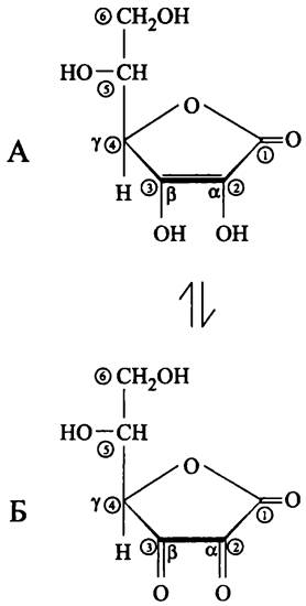 Рис. 277. Аскорбиновая (А) и дегидроаскорбиновая (Б) кислота.