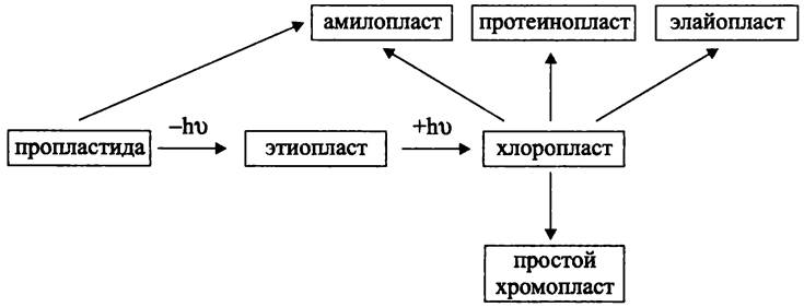 — этиопласты (бесцветны; содержат комплекс тубулярных мембран, или проламеллярное тело; образуются из пропластид; на свету превращаются в хлоропласты);