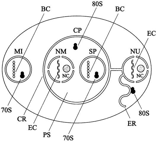Помимо нуклеоморфа в перипластидном пространстве находятся 80S-рибосомы. Таким образом, в сложных пластидах сосуществуют две популяции рибосом (рис. 282). Бактериальные 703- рибосомы локализованы в коре ксеносомы, их 16S рРНК кодируется геномом простой пластиды. Эукариотные 80S-рибосомы расположены в перипластидном пространстве, их 18S рРНК закодирована в геноме нуклеоморфа.