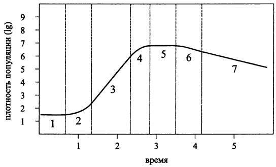 Кривая периодического роста отражает общую ситуацию в автоэкологии, когда численность популяции лимитируется трофическими ресурсами, накоплением побочных продуктов жизнедеятельности и плотностью заселения ниши. Понятно, что потенциально неограниченное экспоненциальное размножение бактерий, когда каждое последующее удвоение числа клеток происходит за один и тот же промежуток времени, не может продолжаться в замкнутой системе до бесконечности. Рано или поздно какой-нибудь субстрат будет исчерпан (точнее сказать, его концентрация снизится до порогового уровня), что приведет к более или менее резкой остановке роста.